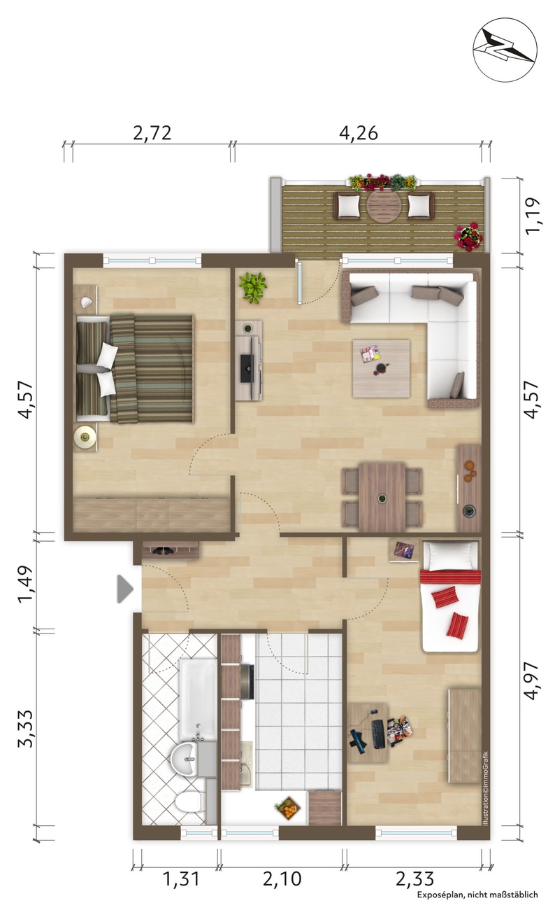 Dieses Exposé stellt kein vertragliches Angebot dar. Für die Richtigkeit und Vollständigkeit der im Exposé enthalten Daten wird keine Haftung übernommen. Änderungen der Angebote sowie eine zwischenzeitliche Vermietung behalten wir uns vor.