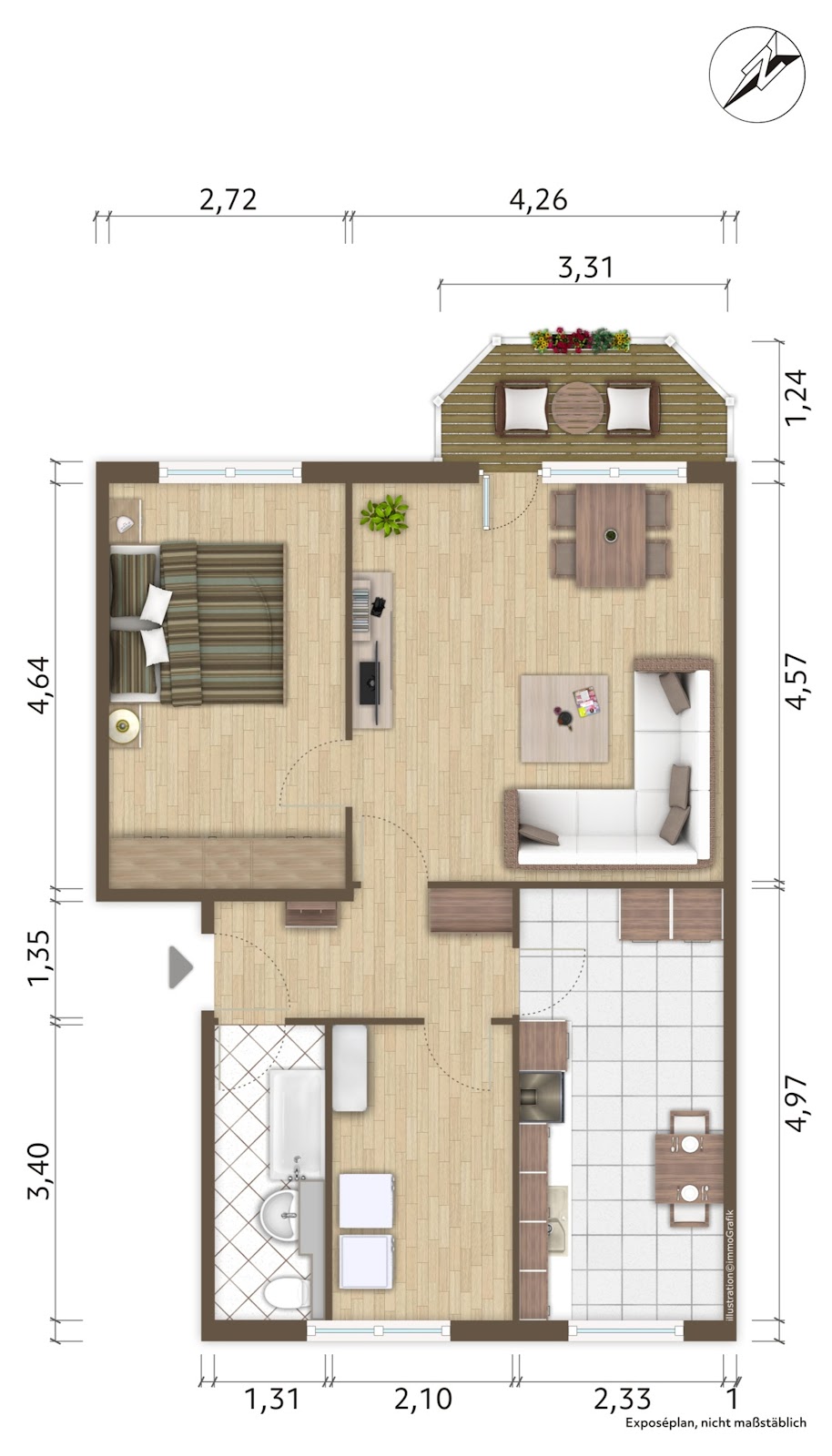Dieses Exposé stellt kein vertragliches Angebot dar. Für die Richtigkeit und Vollständigkeit der im Exposé enthalten Daten wird keine Haftung übernommen. Änderungen der Angebote sowie eine zwischenzeitliche Vermietung behalten wir uns vor.