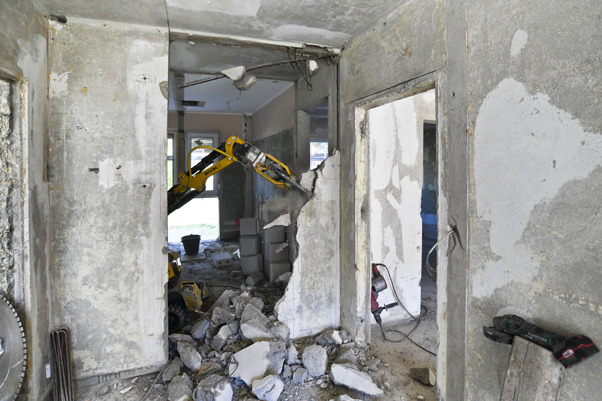 Es erfolgen Betonsäge-, Abbruch-, Maurer- und Trockenbauarbeiten zur Herstellung der neuen Wohnungsgrundrisse. Die Fassade der Eingänge Nr. 27 und 29 ist bereits eingerüstet und der Einbau der neuen Fenster hat begonnen.