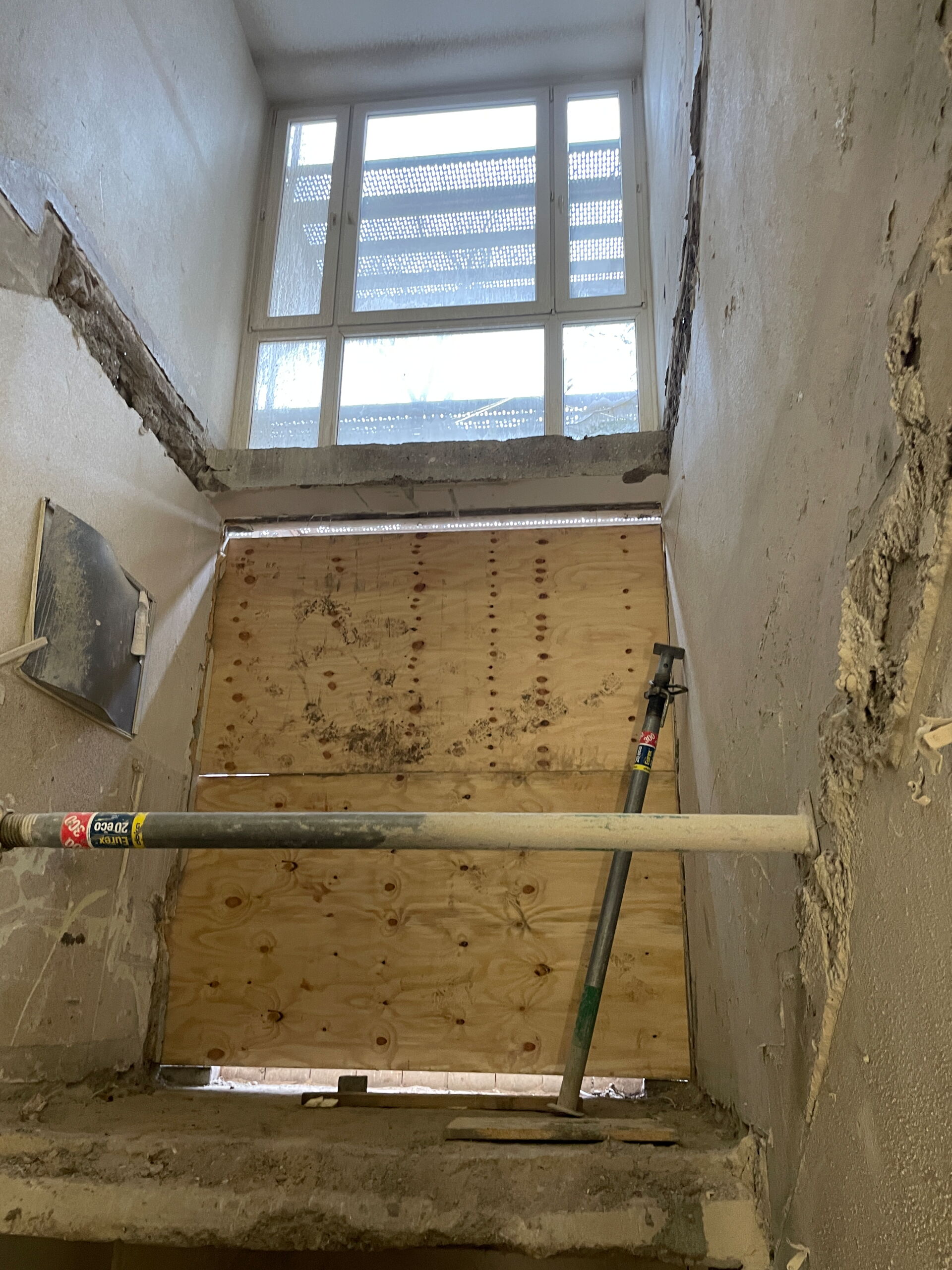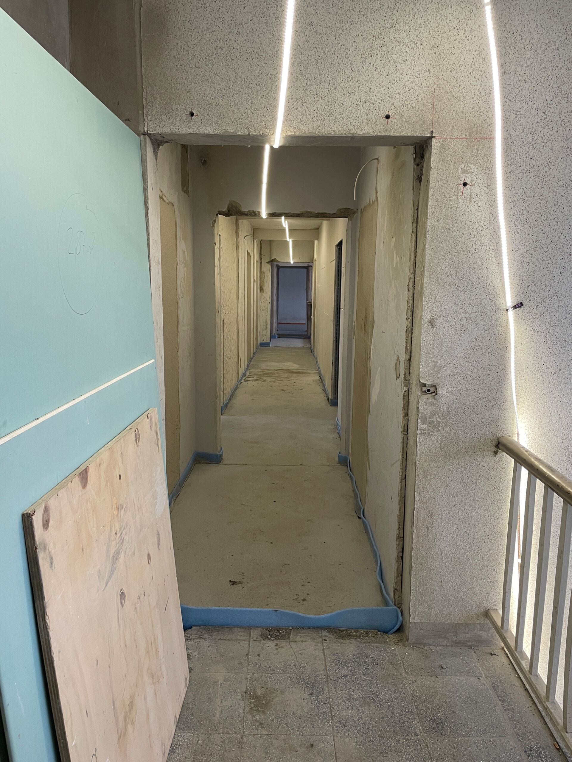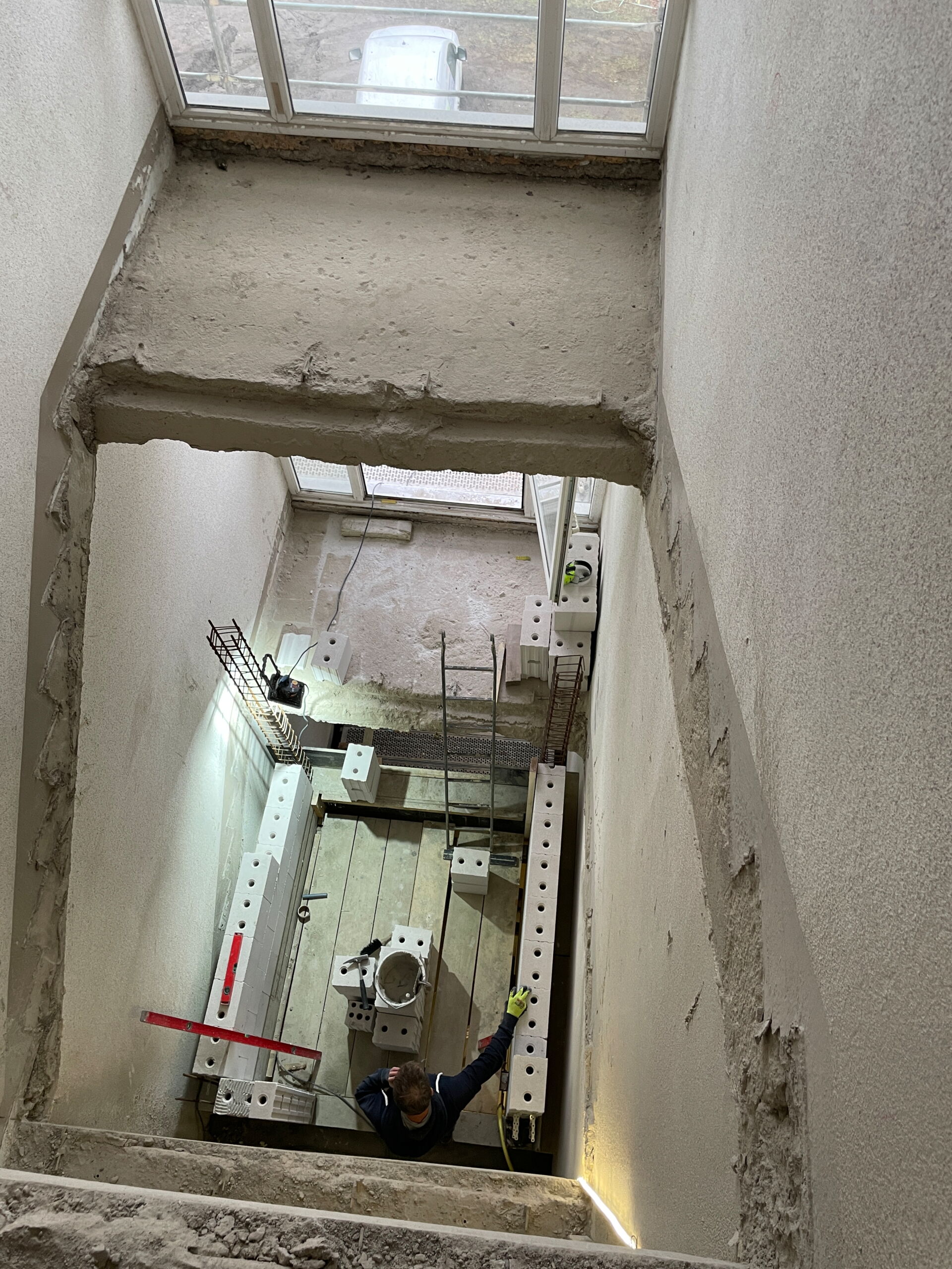Trockenbau-, Elektro-, Heizungs- und Sanitärarbeiten werden in den Eingängen Nr.21/23/25 ausgeführt. Die Mauer- und Betonarbeiten zur Herstellung der Schachtbauwerke für die Aufzugsanlagen werden zurzeit ausgeführt, ein beeindruckendes Bild auf der Baustelle.