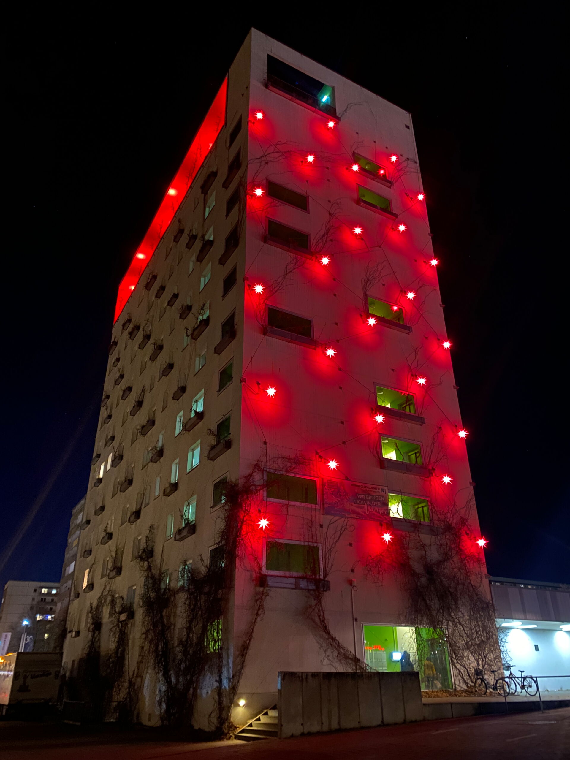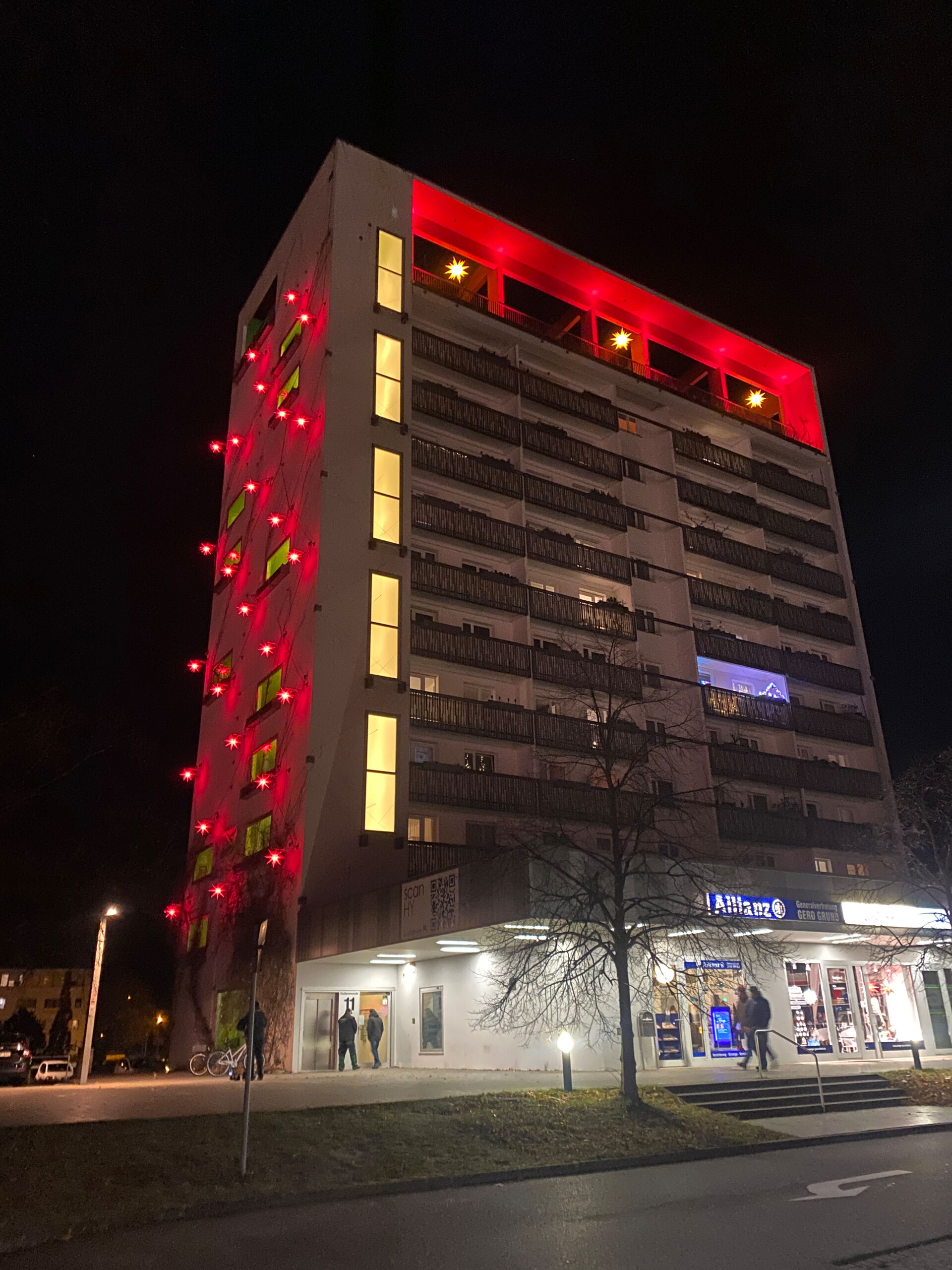 Die Wohnungsgesellschaft mbH Hoyerswerda schmückt ein Wohnhaus im Herzen der Neustadt für wärmende Freude im Winter.